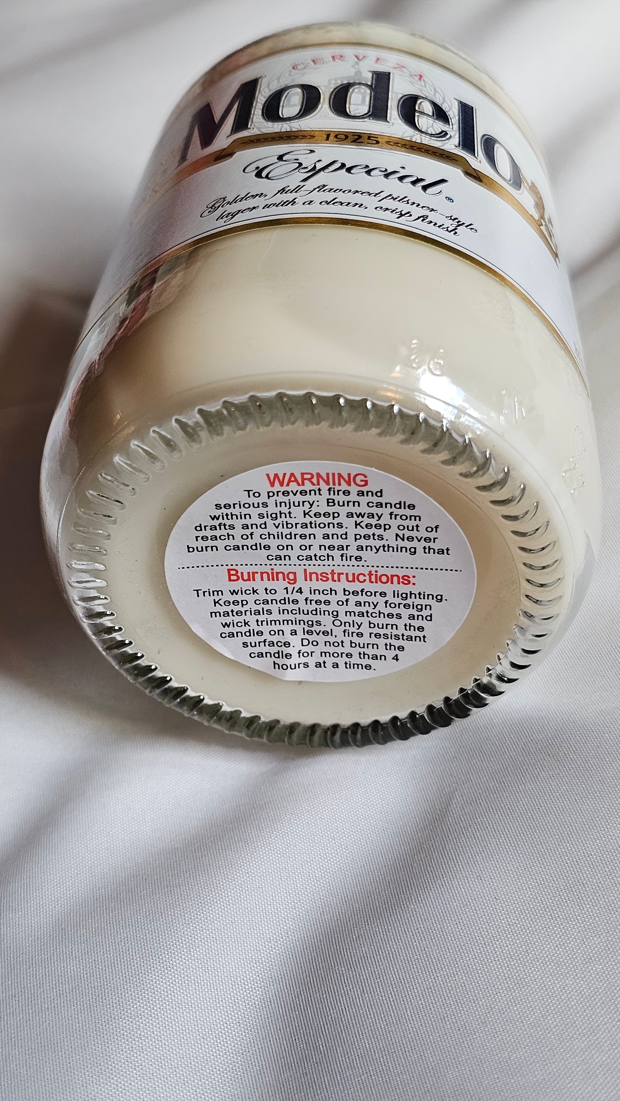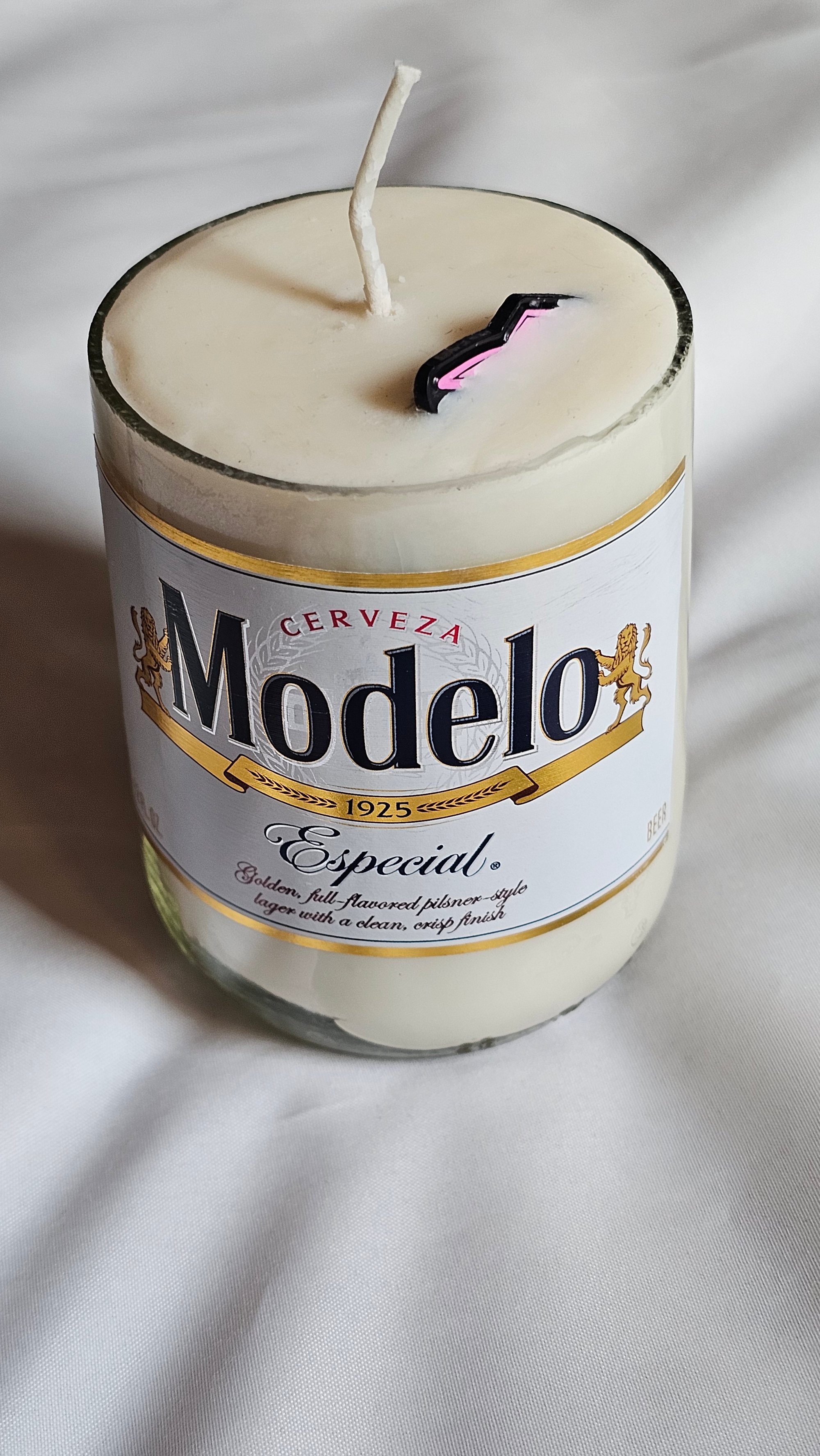 Exclusive hand cut Modelo vanilla candle with mystery pin